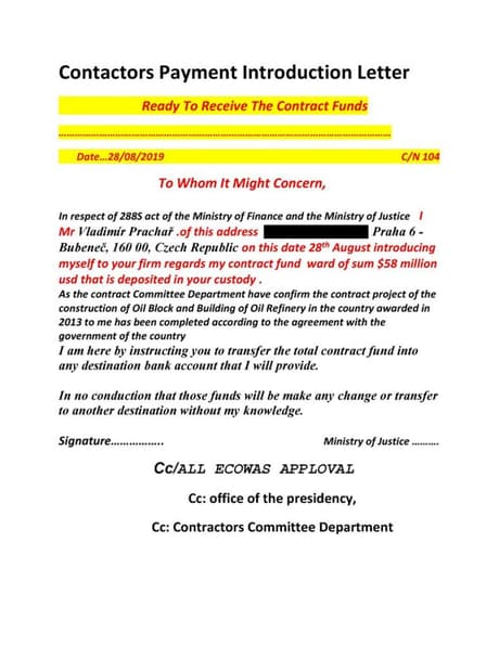 Události se daly do pohybu po pár dnech, kdy Vladimíra kontaktovala beninská pobočka Africké rozvojové banky. Generální rada prý rozhodla v jeho prospěch, a tak si může vybrat jeden ze tří způsobů, jak mu budou peníze doručeny. Buď pošlou zlatou kartu s celým obnosem, nebo mu otevřou vlastní konto, kam budou peníze převedeny. Poslední možností byl klasický bankovní převod na jeho osobní účet. Každá z těchto eventualit byla zpoplatněna. Jednalo se o částky 4234, 1870 a 1764 dolarů. Poplatek však nemohl být stržen z nabízených peněz, neboť ještě nebyly Vladimírovy. Vzít si k tomuto účelu půjčku od beninské banky rovněž nešlo, poněvadž v Beninu údajně poskytují půjčky pouze od 50 tisíc dolarů výše a mají na ně právo pouze občané této země. Vladimír se rozhodl pro zlatou kartu.