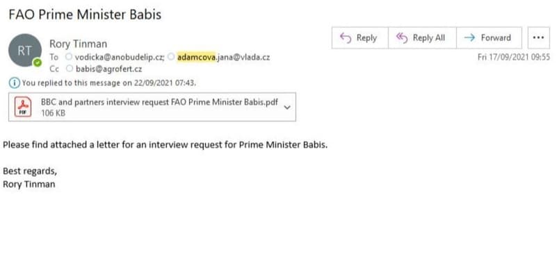 První žádost o rozhovor odeslali za všechna zúčastněná média naši kolegové z ICIJ (Mezinárodní konsorcium investigativních novinářů) 16. září 2021. Když Andrej Babiš nereagoval, zaslalo mu ICIJ třístránkový seznam detailních otázek 20. září a poté opět 22. září 2021, přičemž jej i telefonicky urgovalo. Stejně tak poslalo BBC opakovaně dotazy Janě Adamcové z úřadu vlády a mluvčímu ANO Martinu Vodičkovi. Andrej Babiš ale všechny tyto otázky znovu ignoroval, proto jsme se chtěli akreditovat na tiskovou konferenci 29. září. Nám i našim kolegům ze zahraničních médií byl na základě údajných “kapacitních důvodů” odepřen přístup. Naše kolegyně Hana Čápová se přesto snažila pana premiéra oslovit před tiskovou konferencí, ale nereagoval. Zkusila to tedy znovu o den později, opět bez jeho reakce.