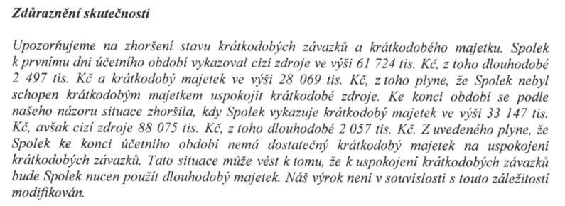 Ke stejnému závěru teď došla také auditorka Eva Sládková z firmy ES Audit. Ačkoli to ve zprávách auditora k účetním závěrkám není běžné, obvykle se spokojí s výroky typu „účetní závěrka podává věrný a poctivý obraz“, auditorka tentokrát přidala odstavec nadepsaný: „Zdůraznění skutečnosti“. Dočteme se v něm, že spolek k prvnímu dni účetního období (rok 2022) vykazoval cizí zdroje ve výši přes 61 milionů korun a majetek ve výši 28 milionů korun. Za rok 2022 se podle názoru auditorky „situace zhoršila“. Krátkodobý majetek sice vzrostl o zhruba pět milionů, na 33 milionů korun, ale „cizí zdroje“, tedy zadlužení, stouplo mnohem víc – o dvacet sedm milionů, na 88 milionů korun.