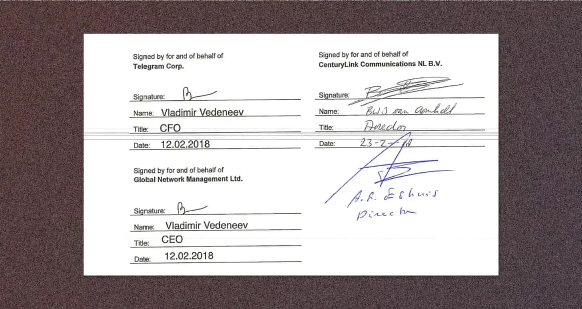 Například již před devíti lety Durov pověřil Věděnějeva podpisem dokumentů, a to z pozice finančního ředitele Telegramu. Jedna smlouva ze soudního spisu zmíněného sporu na Floridě pak dokazuje, že Věděnějevova společnost GNM mohla jednat jménem Telegramu s externím dodavatelem. Věděnějev je ve smlouvě podepsaný dvakrát: jednou coby ředitel GNM a posléze jako finanční ředitel Telegramu.