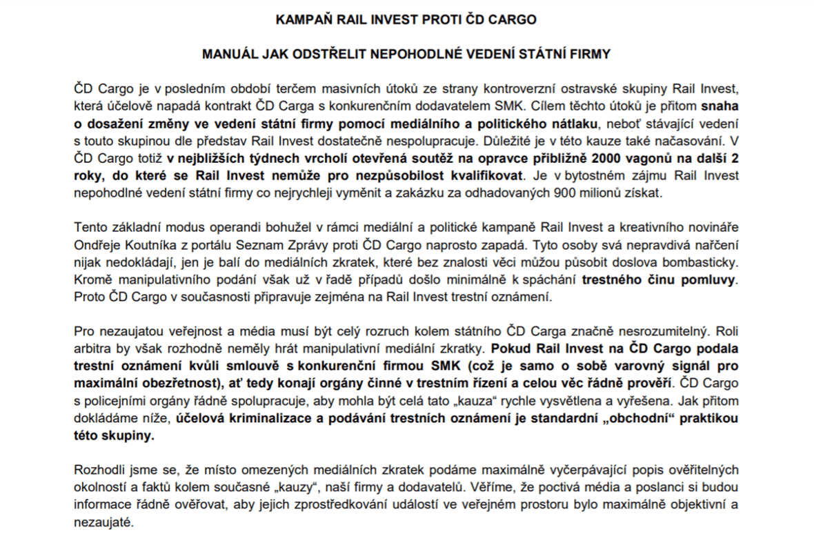 Desetistránkové nepodepsané prohlášení s nadpisem „Kampaň Rail Invest proti ČD Cargo – Manuál, jak odstřelit nepohodlné vedení státní firmy“ se zato obšírně věnuje právě firmě Rail Invest, jejíž právník Ležatka upozornil na tajnou smlouvu a právník Mario Hanák podal kvůli smlouvě s SMK trestní oznámení.