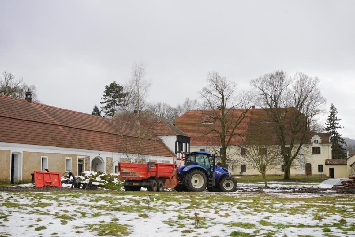 Následující ráno zaparkujeme o kus dál od rozlehlého panství. Žlutá budova stojí v mírném kopci, proto ji vidíme už z dálky. Dům je nově opravený, před ním dvůr s kamennou dlažbou a okolo zřejmě bývalá hospodářská stavení. Ta jsou ale zrekonstruována jen zvenku a zčásti jim chybí okna. Uvnitř jsou vidět staré cihlové stropy s klenbou a uskladněné plastové židle.