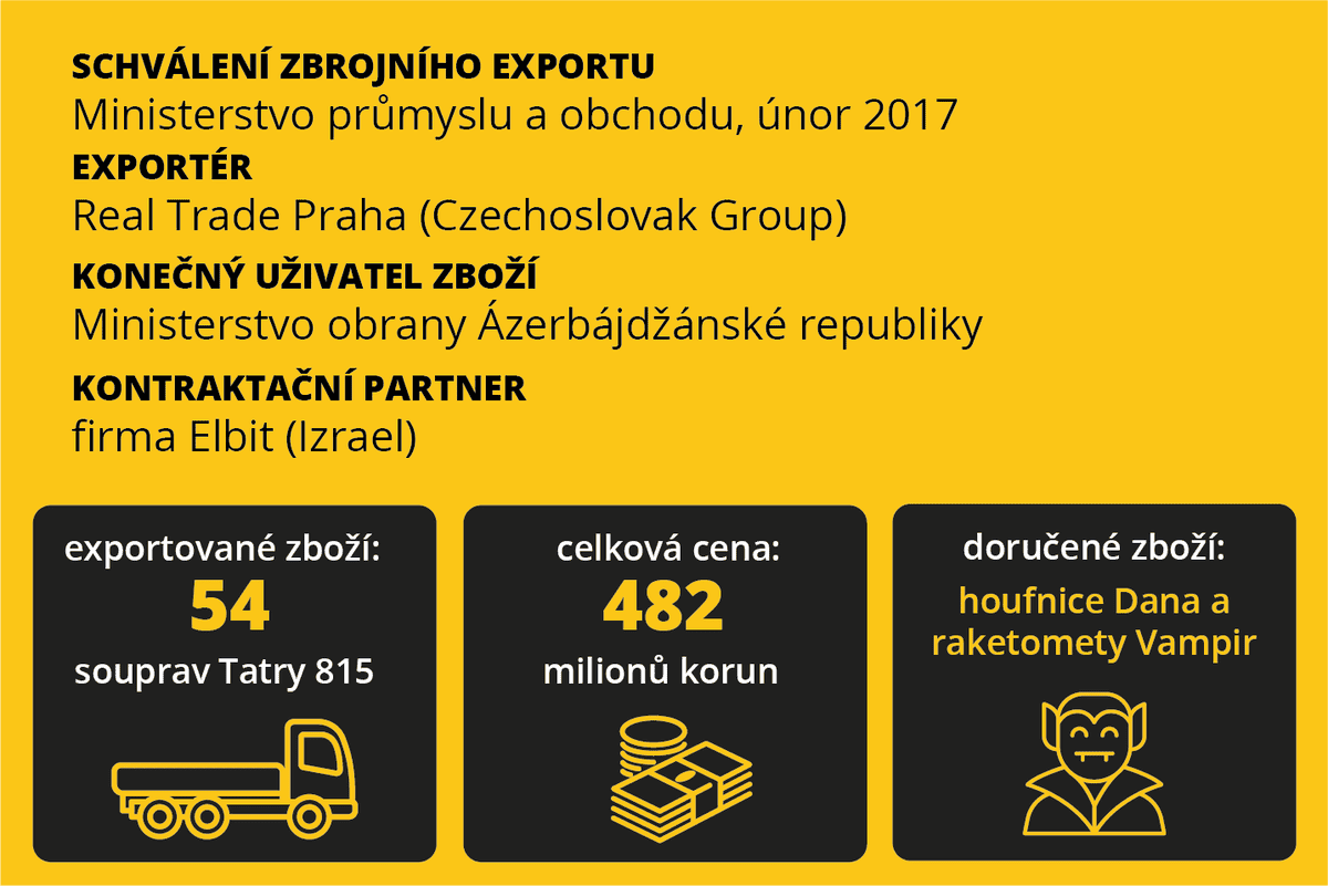 Když se před dvěma lety ázerbájdžánská armáda v propagačním videu chlubila českými houfnicemi Dana a raketomety Vampir, vzbudilo to mimořádnou pozornost médií: Česko totiž oficiálně do této země bojová vozidla nevyváží. Zbrojařská skupina Czechoslovak Group tehdy přispěchala s prohlášením, že v souladu s licencí vyvezla jen podvozky Tatra, od houfnic a raketometů se distancovala i česká ministerstva. Jenže nová zjištění reportérů investigace.cz ukazují, že s úpravou podvozků na houfnice a raketomety ministerstva od začátku počítala, stejně jako s jejich vývozem do Ázerbájdžánu – navzdory doporučením ze strany OSN, EU a OBSE. Uniklé dokumenty ukazují, že k finální úpravě podvozků na bojová vozidla došlo na Slovensku – a to stejným holdingem, který podvozky vyvezl z Česka.