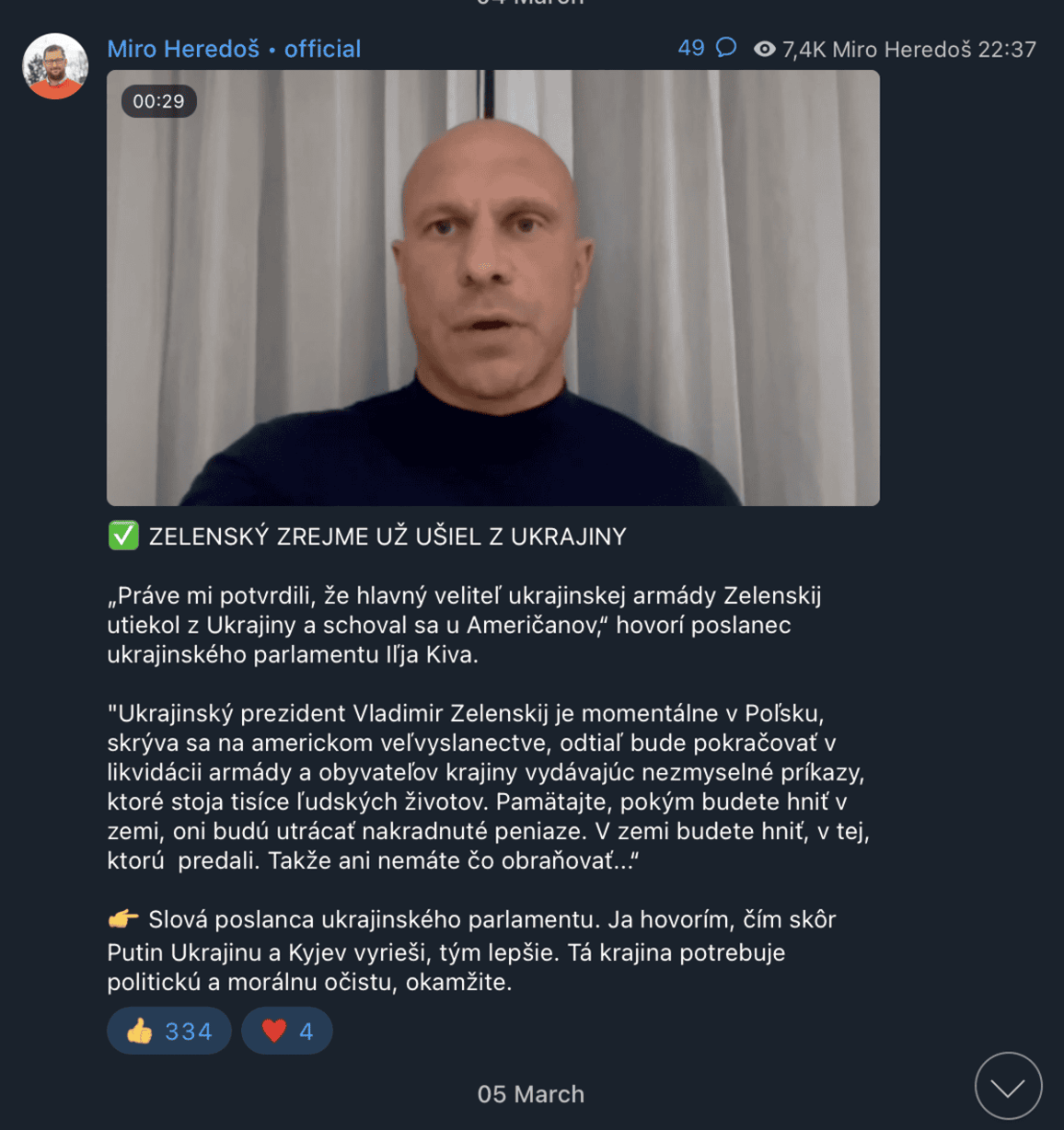 Telegram je i nadále informačním kanálem pro politické osobnosti a strany, v současnosti na něm ale převažují spíše slovenské politické subjekty a strany. Aktivní je v tomto směru například Štefan Harabin či účet strany Republika i jednotlivých politiků z této partaje nebo s ní spojených. Také se zde můžeme setkat s účty, jež silně propagují ruskou interpretaci invaze. Příkladem může být účet bývalého člena strany Republika Miroslava Heredoše, který se uchází o vedení Bratislavy. Na jeho účtě se setkáme s celou řadou postů, jež propagují ruský narativ o Ukrajině.