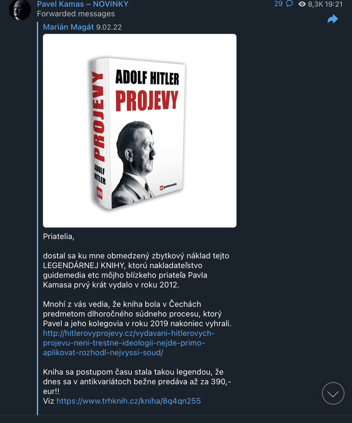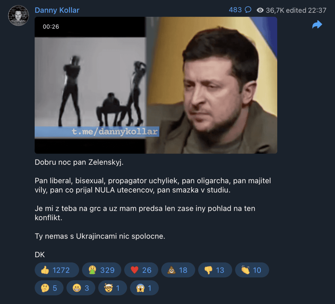 Dnes je však situace trochu jiná. Anticovidové a antivakcinační účty jsou sice stále aktivní, do popředí se však dostávají kanály, jež často přímo či nepřímo prosazují ruský pohled na situaci na Ukrajině. Výjimkou není ani otevřeně antisemitský obsah či obsah zaměřený rasisticky nebo proti sexuálním menšinám. Příkladem může být zřejmě jeden z největších účtů v rámci česko-slovenského prostoru pod jménem Slováka Dannyho Kollara. Loni v létě neměl ani tisíc odběratelů, dnes jich má více než 33 000. Aktuálně je tak pravděpodobně největším kanálem mezi českými a slovenskými účty. Jeho popularitu na Telegramu ještě posiluje skupina Vakcináckovia, jejíž členové se sami definují jako „nezavisla verejna skupina fanusikov Danny K a jeho, a nielen jeho prace“.