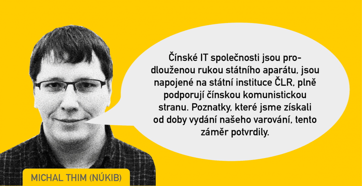 „Čínské IT společnosti jsou prodlouženou rukou státního aparátu, jsou napojené na státní instituce ČLR, plně podporují čínskou komunistickou stranu. Poznatky, které jsme získali od doby vydání našeho varování, tento záměr potvrdily,“ vysvětluje Michal Thim z oddělení strategických informací a analýz Národního úřadu pro kybernetickou a informační bezpečnost.