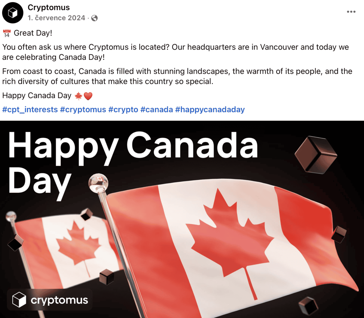 Oficiálně se Cryptomus prezentuje jako kanadská firma Xeltox Enterprises LTD se sídlem ve Vancouveru. Podle zjištění kanadských novinářů z Investigative Journalism Foundation však jde o virtuální adresu, kterou v minulosti využívaly desítky společností zapojených do praní peněz. Dřívější název firmy byl až do dubna 2024 Certa Payments Ltd.