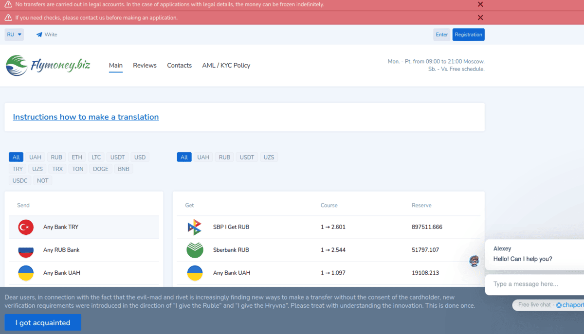 Navíc přinejmenším padesát šest krytpoměnových směnáren včetně casher.su, flymoney.biz, obama.ru nebo swop.is používá podle Sanderse služeb Cryptomusu pro zpracování svých transakcí. Zmíněné platformy jsou určeny hlavně rusky mluvícím uživatelům a poskytují možnost anonymně směnit jednu formu kryptoměny za jinou. V nabídce mají i převod peněz ze Západu do ruských bank s možností vybrat hotovost v místních pobočkách – téměř na všechny pobočky uvalily Spojené státy a další západní země v současnosti sankce.