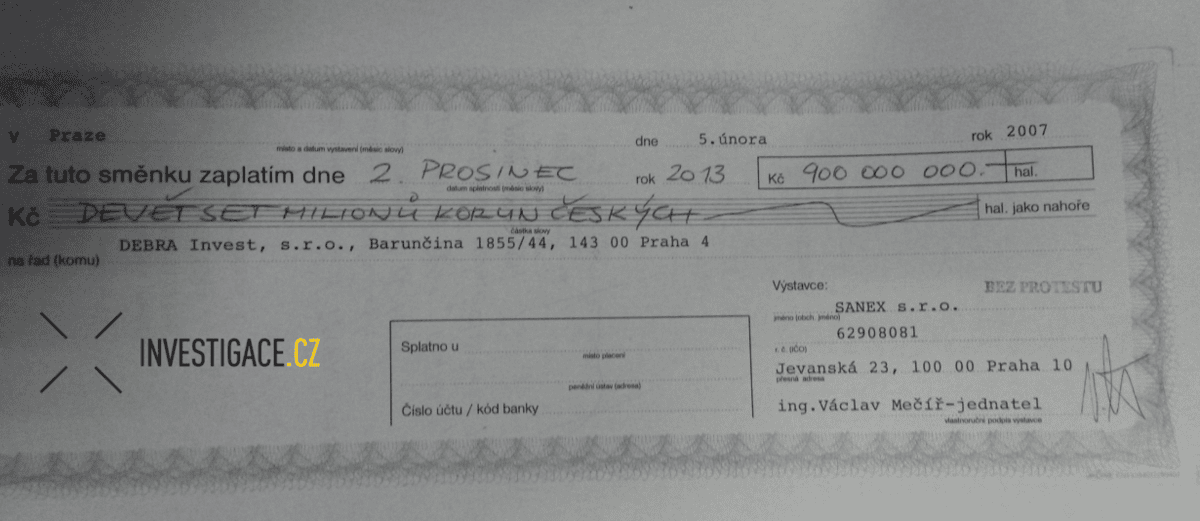 Zjistit víc o samotné směnce byl ale větší oříšek. Řediteli Karetovi se stalo vodítkem datum jejího vzniku (5. 2. 2007) a další údaje na směnce. Došel k závěru, že ji vystavila firma Sanex a posléze převedla na firmu Debra Invest, která ji dále převedla na Technoexport.