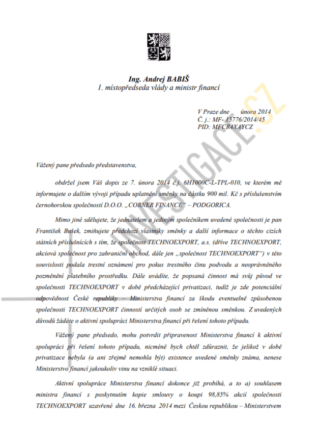 V oficiálním dopise ministra Babiše Tomáši Plachému stojí: „Zmiňujete, že společnost Technoexport podala trestní oznámení pro pokus trestného činu podvodu a neoprávněného pozměnění platebního prostředku. Dále uvádíte, že popsaná činnost má svůj původ ve společnosti Technoexport v době předcházející privatizaci, tudíž je zde potenciální odpovědnost České republiky – ministerstva financí za škodu způsobenou společnosti Technoexport činností určitých osob se zmíněnou směnkou. Z uvedených důvodů žádáte o aktivní spolupráci ministerstva financí při řešení tohoto případu.“