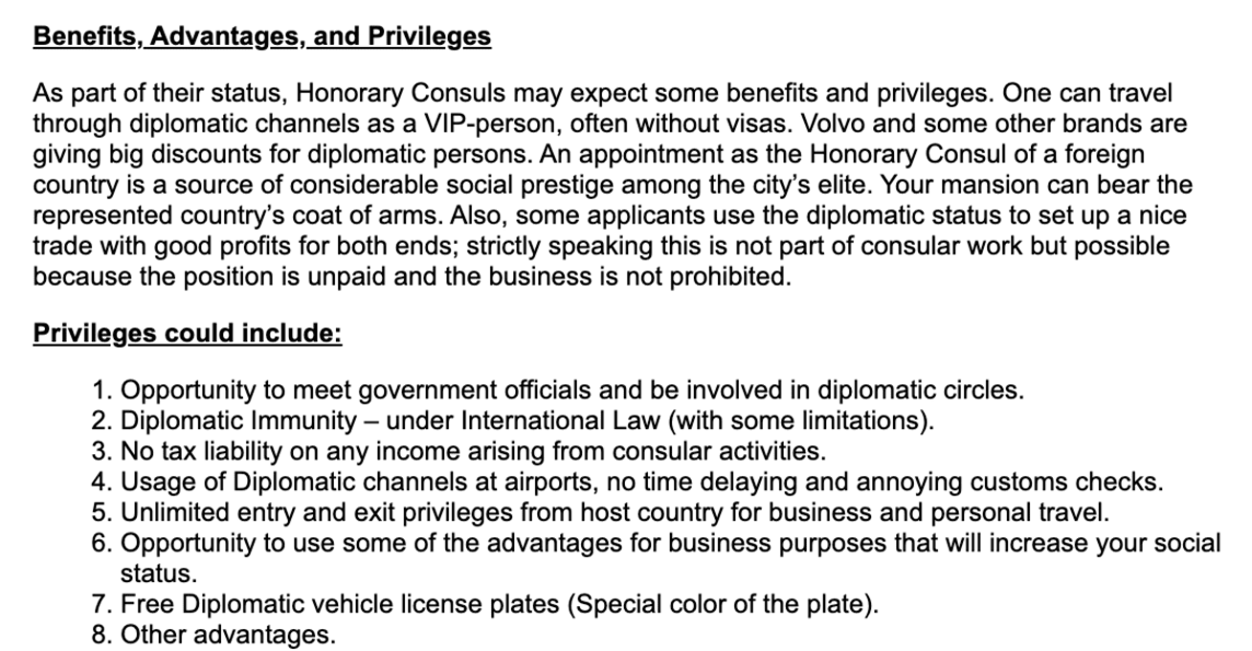 Titul se stal žádaným natolik, že se podle novinářů z ICIJ na internetu objevili online konzultanti nabízející zajištění funkce konzula za poplatek v hodnotě desítek tisíc dolarů. Třeba společnost Elma Global slibuje: „Cestujte diplomatickými kanály jako VIP osoba.“