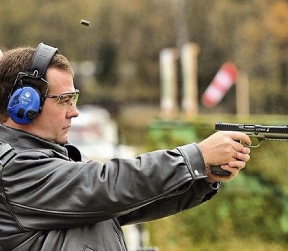 Ano, narazila jsem na fotografii, kde Medvěděv tuto pistoli osobně testuje.