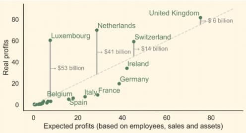 Tax Justice Network provedla analýzu dat publikovaných Spojenými státy, která ukazují, kde přiznávaly americké firmy zisky za roky 2016 a 2017. Namísto toho, aby zisky vykazovaly v zemích, kde je vytvořily, přesunuly v roce 2017 zisky v hodnotě 115 miliard dolarů (2,8 bilionu Kč) do Spojeného království, Švýcarska, Lucemburska a Nizozemska, kde jsou sazby daně z příjmu korporací v praxi mnohem nižší. Činí tak proto, aby mohly v jiných evropských zemích přiznat méně vydělaných peněz a zaplatit tak o miliardy méně na daních z příjmu. Samotné Spojené království, Nizozemsko, Švýcarsko a Lucembursko jsou společně odpovědné za polovinu světového vyhýbání se placení daní z příjmu.