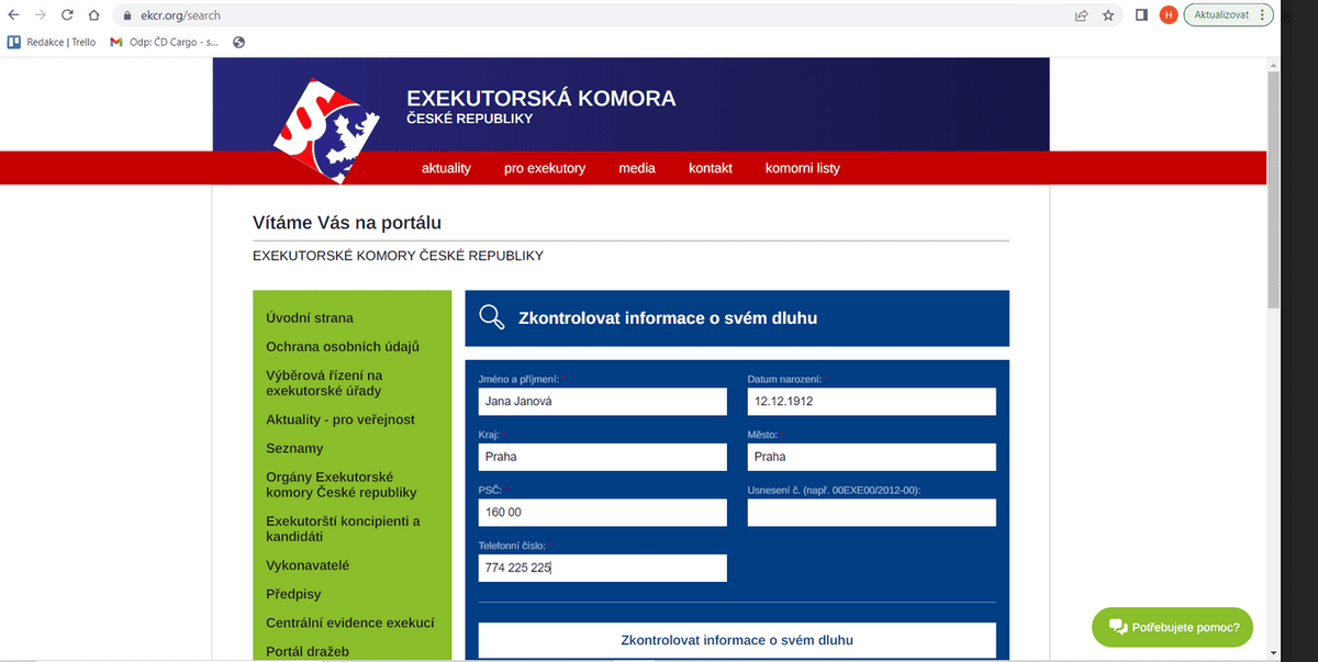 Sušánkovi pak vysvětlila, že dluhy komora nevymáhá, to dělá úřad konkrétního exekutora sám. Exekuce sice komora eviduje, za poplatek si je může každý najít, ale na jiné adrese, než přes kterou měl platit – opravdová Centrální evidence exekucí má stránky www.ceecr.cz.