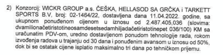 Výběrové řízení bylo i přes protesty vyhlášeno na konci března 2022. Přihlásila se do něj dvě konsorcia společností. O tři týdny později již zakázka znala vítěze – konsorcium složené ze tří společností, vedených českou firmou Wickr Group, a. s. Součástí konsorcia byly dále společnosti Hellasod SA z Řecka a nizozemská Tarkett Sports B. V. Stížnosti ostatních firem bosenská FA (Fotbalová asociace) i UEFA přešly a konsorcium započalo 1. června práce na hřišti stadionu Banja Luka a v dalších čtyřech sportovních stáncích.