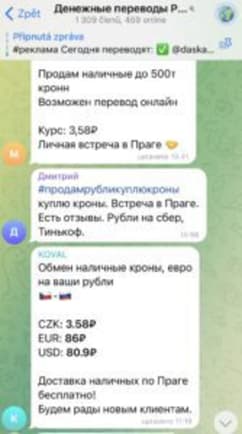 Veřejný telegramový kanál „Peněžní převody z Ruska do Česka“ dnes čítá 1 300 členů – jak provozovatelů směnáren, tak jejich klientů. Správci kanálu upozorňují, že nenesou odpovědnost za obsah nabídek a případné podvody, jež by se mohly ve skupině vyskytnout. Princip fungování je stejný jako u směnáren v Moskvě – po převodu peněz (rublů či kryptoměny) z Ruska se představitel směnárny osobně setká s klientem v Česku a předá mu domluvenou částku v korunách.