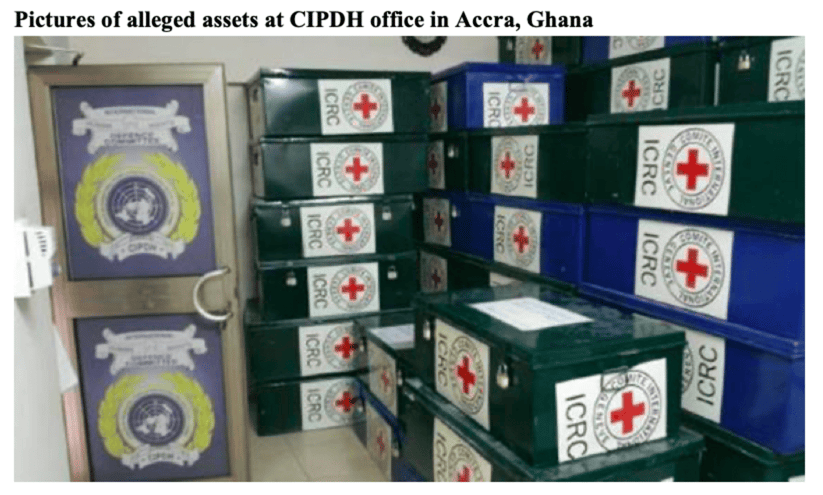 Zpráva Rady bezpečnosti OSN z roku 2017 uvádí, že CIPDH možná využívala své kanceláře v ghanské Akkře k uložení části majetku libyjského diktátora Muammara Kaddáfího, kdysi považovaného za jednoho z nejbohatších lidí na světě. Jednalo se o majetek, který Kaddáfí vyvezl ze země před svou smrtí. Na fotografii ve zprávě OSN jsou vidět desítky krabic s penězi, o nichž se předpokládá, že patřily mrtvému diktátorovi. Hned vedle nich se na dveřích skví obrovské logo CIPDH. Ve zprávě OSN se dále píše, že žádosti o další informace nechaly ghanské úřady bez odpovědi. Ghanské velvyslanectví ve Washingtonu se k celé záležitosti odmítlo vyjádřit.