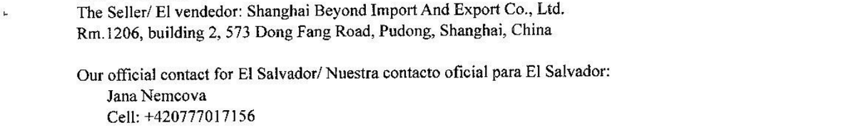 E-mailová adresa, kterou při komunikaci se salvadorským zdravotnictvím osoba jménem Jana Němcová používala, [email protected]. Z této adresy odpovídala a vždy se podepisovala jako Jana Němcová. Podle svých slov, jak jsme zjistili od existující Jany Němcové, ale takovou adresu nikdy nepoužila a nevlastnila. Adresa ale existuje a v roce 2017 se objevila u inzerátu nabízejícího prodej notebooku v Brně. Jako další kontakt jsou ve smlouvách uvedena dvě česká telefonní čísla: +420 777 017 156 pro záležitosti týkající se Shanghai Beyond a +420 723 352 989 pro otázky ohledně Lasca Design.