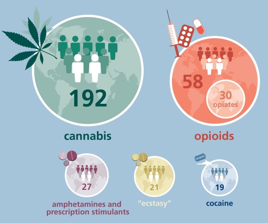 Užívání drog je obecně na vzestupu. V roce 2018 bylo na světě 269 milionů uživatelů, což je 5,3 % celosvětové populace. Největší nárůst v počtu uživatelů drog se za poslední desetiletí objevil v rozvojových zemích, jejichž obyvatelstvo častěji podléhá drogové závislosti, což souvisí i s kvalitou vzdělání, nezaměstnaností a sociálním vyloučením. Závislý se v této situaci dostává do začarovaného kruhu, kde chudoba a ostrakizace ještě více pohání jeho návyk. Na druhou stranu však stále nejvíce berou drogy lidé v bohatých státech. Tento jev je především podmíněn vyššími příjmy obyvatel, příkladem může kokain a jeho pověst drogy pro bohaté. V rozvinutých zemích lidé používají drogy spíše rekreačně, pro zábavu. Zpráva rovněž uvádí, že omamné látky se konzumují více ve městech než na venkově – v městských oblastech přitom žije téměř polovina celosvětové populace.
