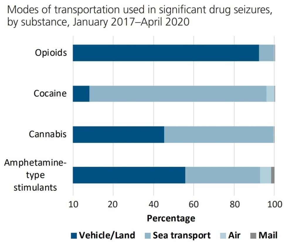 UNODC se také domnívá, že díky téměř zastavené letecké, železniční a osobní dopravě se drogy již začaly mnohem více pašovat po moři. Je to méně nápadné a na loď se vejde i více zboží. Takto například putují dodávky kokainu z Jižní Ameriky přímo do Evropy. Heroin z Afghánistánu se pro změnu pašuje přes Írán, Turecko a Balkán do východní a střední Evropy. V Mexiku zase vyrostly obrovské továrny na výrobu pervitinu a vytlačily z amerického trhu malé laboratoře z USA.