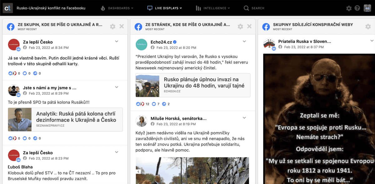 První z nich se jmenuje Ze skupin, kde se píše o Ukrajině a Rusku, a zobrazuje posty z otevřených českých facebookových skupin, jež obsahují slova jako Ukrajina, Rusko či Putin.