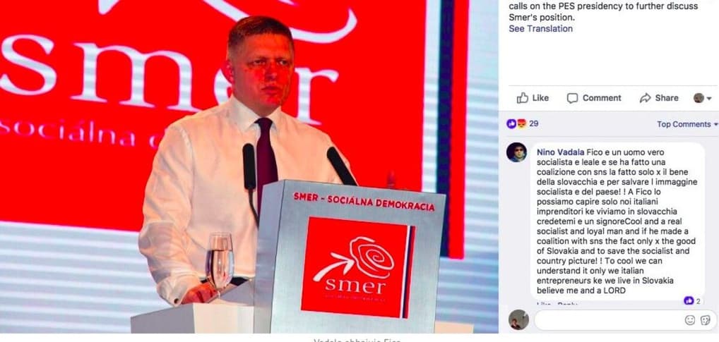 Smer v komunálnych voľbách. Samotný Vadala Smer masívne podporuje aj v kampani na sociálnych sieťach. Fica chválil medzi Talianmi, Kaliňáka bránil pred intrigánskou opozíciou, a s Rašim sa hecovali k víťazstvu vo voľbách.
