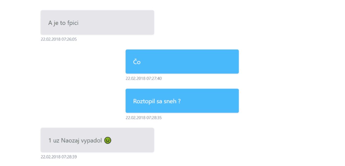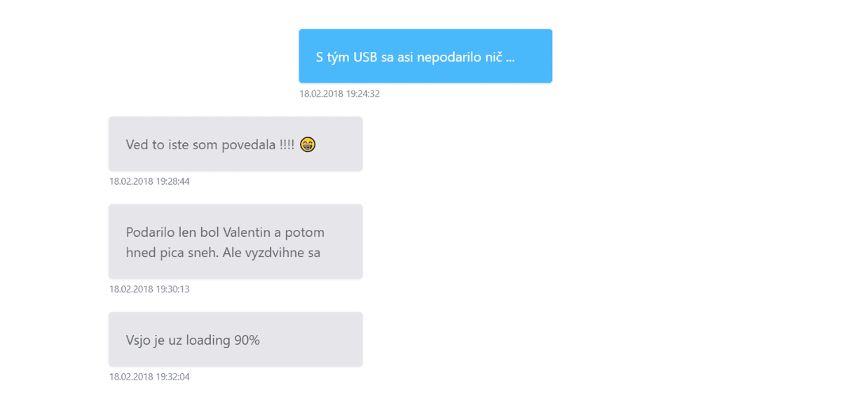 „Zůstaň hezky doma a odhazuj sníh :P :P :P“ „Myslíš, že z legrace nadávám na ten skuvený sníh?“ „Mám spoustu důvodů být nervózní. Nenávidím zimu, nenávidím sníh, nenávidím čekat a tato zima ne a ne skončit.“ „Co tak vzít lopatu a jít odhazovat sníh?“ „Pii, kuva tam i s pojebným sněhem. Od teď ho nesnáším ještě víc.“