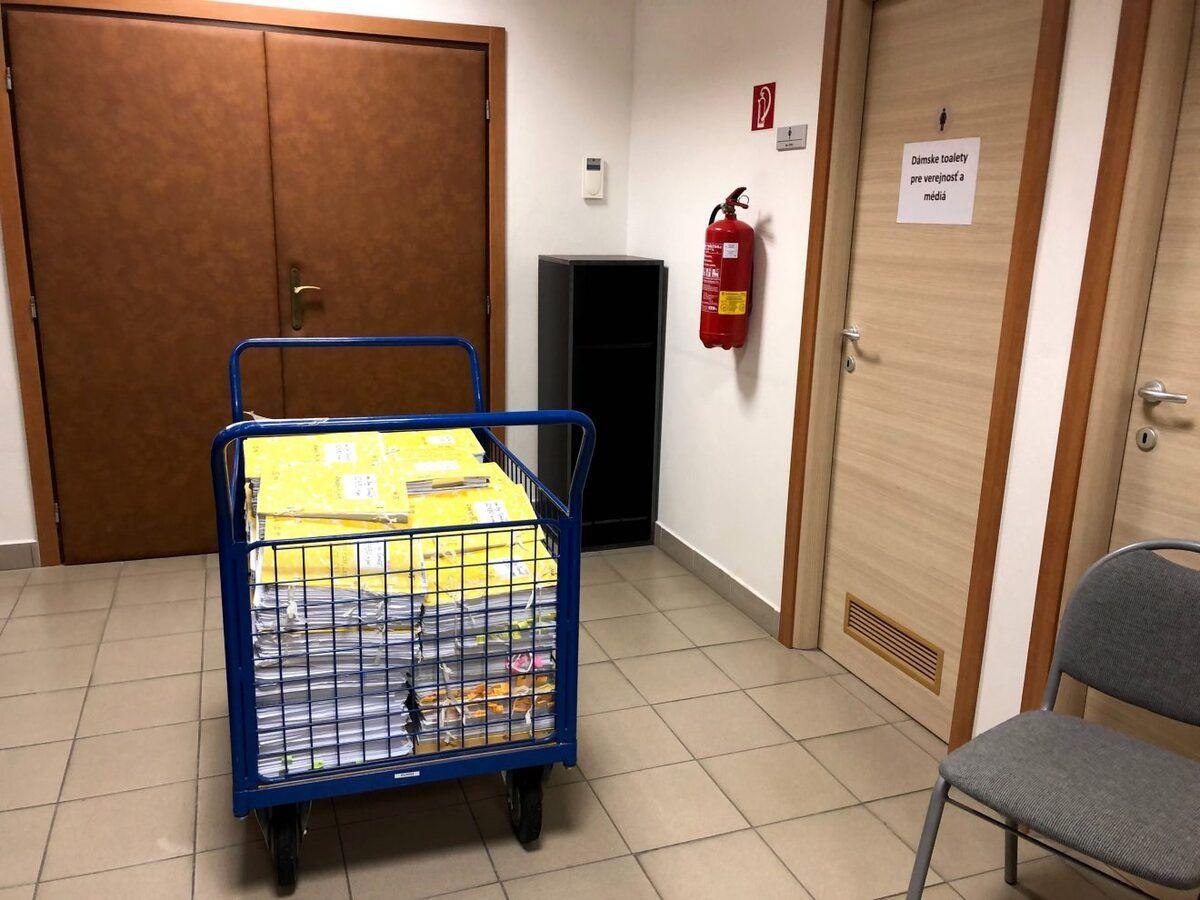 8:19 Soudní zřízenci dovezli do projednávací místnosti spis, který má několik desítek svazků.