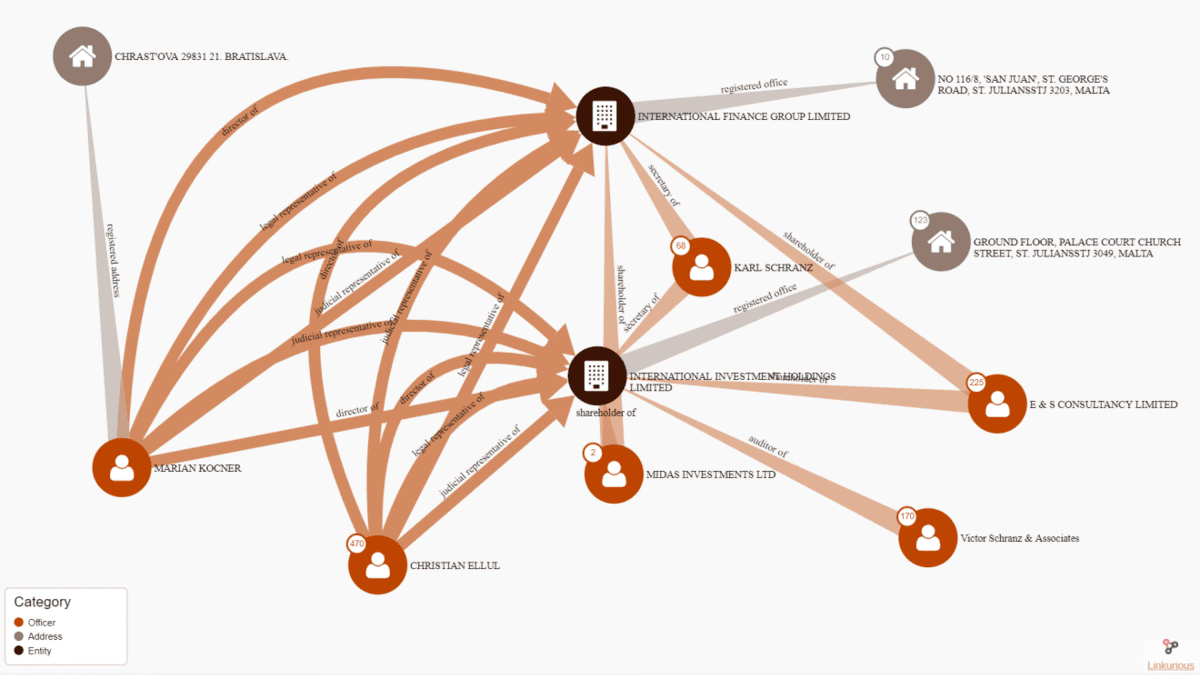 Na Maltě měl Kočner zapsané dvě firmy: první je International Investment Holding Limited, která byla psaná na Mariána Kočnera a Christiana Ellula, na Slovensku tato firma figuruje v kauze nadměrného odpočtu DPH. Druhou je pak International Finance Group Limited. Akcionářem obou společností je E&S Consultancy, tedy firma Christiana Ellula a jeho obchodního partnera Karla Schranze.
