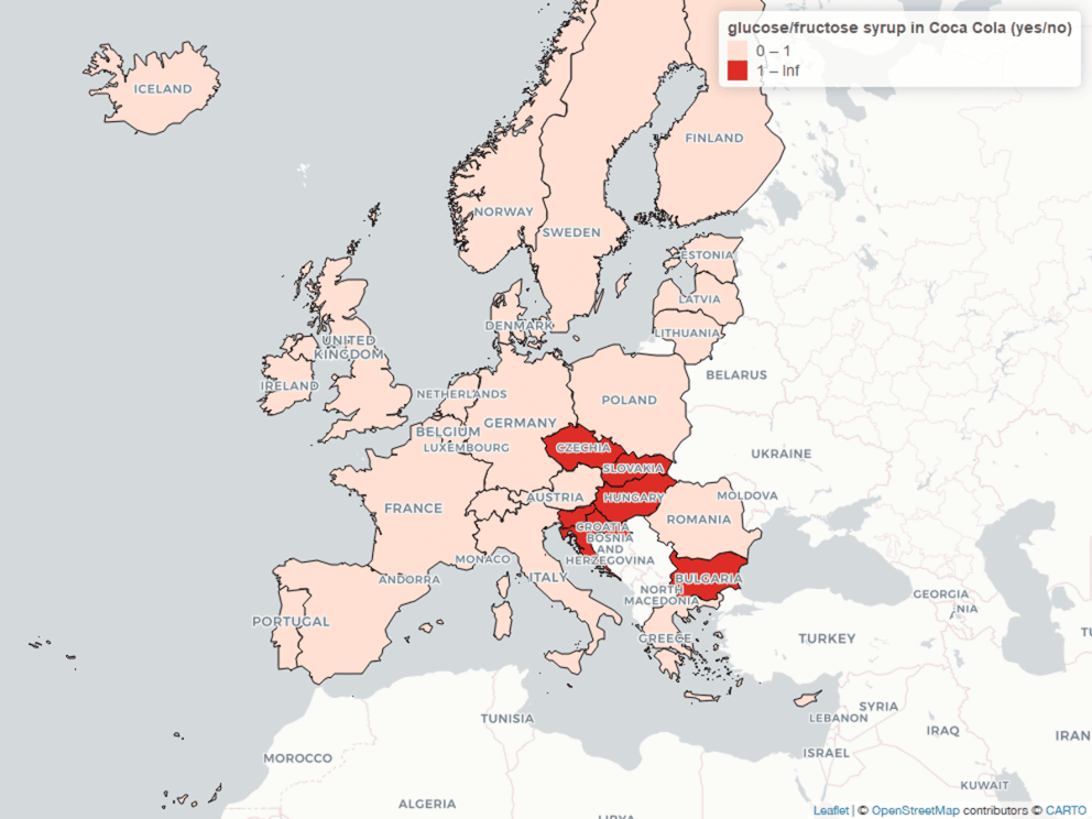 (Glukózo-fruktózový sirup je do Coca Coly přidáván v zemích vyznačených červenou.)