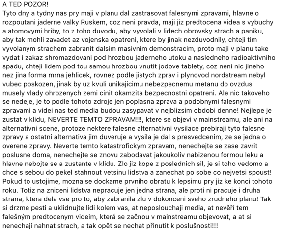 Ačkoli se na šíření odkazů na konspirační a dezinformační servery podílejí jen na českém Facebooku stovky skupin, zdá se, že počty interakcí s těmito posty nedosahují čísel z covidového období. Příčin může být několik. Svoji roli zcela určitě hraje blokace některých stránek od provozovatelů připojení. Je také velmi pravděpodobné, že zájem o anticovidová témata přece jen upadá a výslovně proruské postoje nejsou ve společnosti až tak silně zastoupeny. Byť se můžeme občas setkat i s posty, které v sobě obě témata spojují velmi kreativním způsobem.