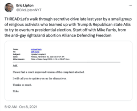 Právě Michael Farris z okruhu Trumpovi blízkých osobností měl důležitou roli ve snahách zpochybnit výsledky prezidentských voleb. Farris poslal podrobný návrh žaloby, kterou nakonec podal texaský generální prokurátor proti několika státům ohledně protiústavnosti prezidentských voleb. Navíc také spolupracoval na několika případech se zmíněným Johnem Eastmanem.