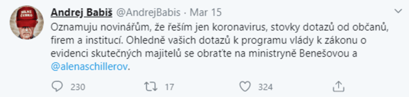 Premiér náhlou změnu programu jinak odmítl komentovat a napsal na Twitter: „Oznamuju novinářům, že řeším jen koronavirus, stovky dotazů od občanů, firem a institucí. Ohledně vašich dotazů k programu vlády k zákonu o evidenci skutečných majitelů se obraťte na ministryně Benešovou a Schillerovou.“