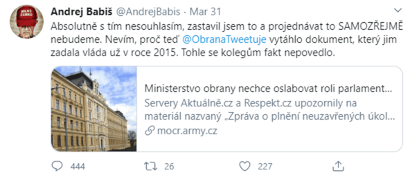 „Absolutně s tím nesouhlasím, zastavil jsem to a projednávat to SAMOZŘEJMĚ nebudeme. Nevím, proč teď ministerstvo obrany vytáhlo dokument, který jim zadala vláda už v roce 2015. Tohle se kolegům fakt nepovedlo,“ napsal premiér Babiš v úterý 31. března na Twitteru a veřejně tím popřel jakoukoli účast na tvorbě návrhu.