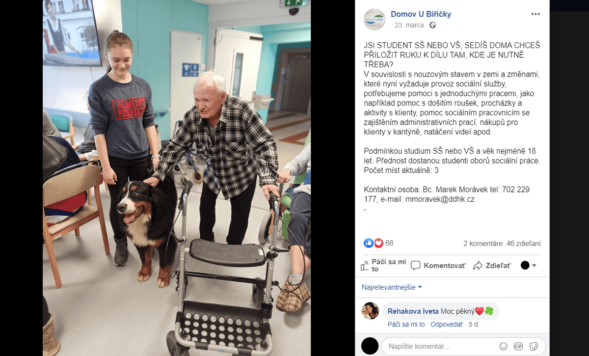 Pro představu, U Biřičky máme teď v přímé péči o 15 % personálu méně, protože čerpají ošetřování (člena rodiny nebo péče o dítě – pozn. red.) nebo jsou v pracovní neschopnosti. Nedostatek personálu v sociálních službách jsme v médiích rozebírali už letos v lednu, když jsme měli potíže s náborem zaměstnanců z ciziny. Nic se na tom nezměnilo a do toho přišla současná kritická situace a já musím někým nahradit například naše zaměstnankyně-matky, které chtějí chránit své děti a být s nimi doma, což je logické. I takto nám klesl počet personálu. Pokud to jde, pokoušíme se ho nahradit brigádníky nebo dobrovolníky, například studentkami vysokých škol, které teď musí být doma a mají chuť nám pomoci.
