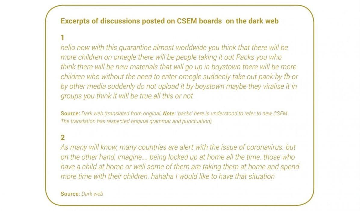Alarmujícím závěrem zprávy Europolu je, že přibývá případů online zneužívání dětí a útoků na ně. Tomu napovídá několik dílčích faktorů – sice se nezvýšil počet zachycených stránek s tímto obsahem (což ale může být připsáno i práci zaměstnanců příslušného odvětví Europolu z domova, a tedy menší manuální kontrole softwarem označených stránek), narostl ale počet vyhledávání těchto materiálů a pokusů o navštívení nelegálních webů. Vzrostl i počet stížností veřejnosti lokálním policejním složkám. V některých zemích se sexuální delikventi častěji pokoušejí nezletilé kontaktovat přímo přes sociální sítě.