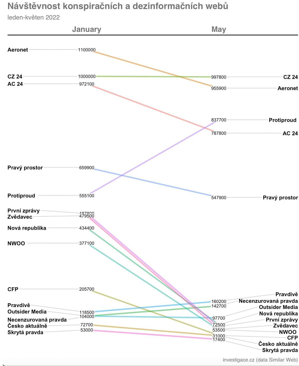 Návštěvnost konspiračních a dezinformačních webů (leden - květen 2022):