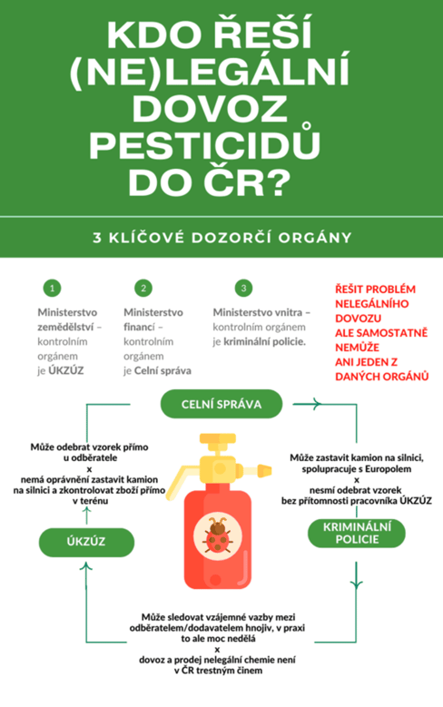 Kompetenci odebrat vzorek z převáženého zboží nebo z pole má Ústřední kontrolní a zkušební ústav zemědělský. Nelegální chemie do Česka ale putuje po dopravních tepnách z velkých přístavů a kontrolor ÚKZÚZ ji sám nevystopuje, neboť nesmí zastavit kamion třeba na dálnici. To může celní správa. Ta sleduje zboží dovážené ze třetích zemí a daňové úniky, zejména padělky. Měla by tak být „akční“ složkou celého kontrolního řetězce, alespoň podle České asociace ochrany rostlin. Ve skutečnosti je to zřejmě jinak.