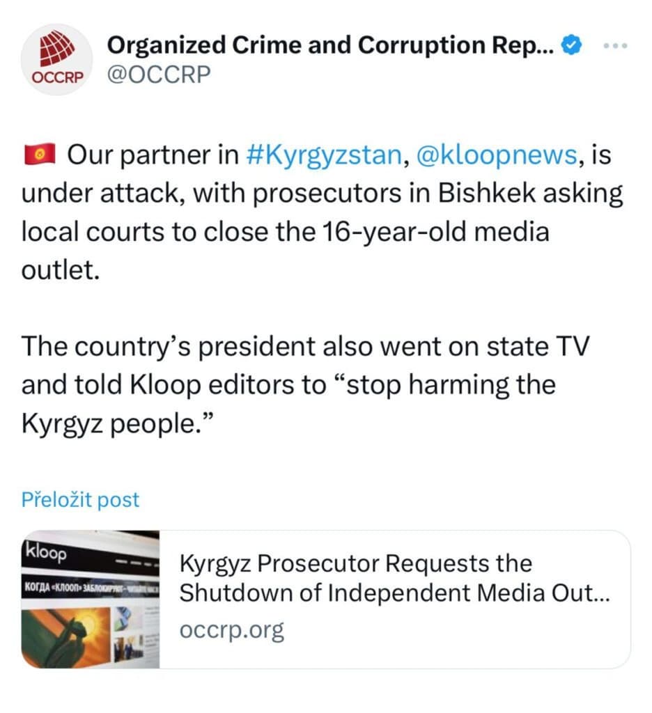 Kyrgyzské úřady přitvrdily vůči tamním nezávislým médiím. Soud nařídil uzavření investigativní platformy Kloop Media, která je členem nadnárodní novinářské sítě Organized Crime and Corruption Reporting Project již od roku 2017 a byla prvním členským centrem OCCRP ve střední Asii, tedy v regionu, kde nemá investigativní žurnalistika příliš rozvinutou tradici. Údajným důvodem uzavření je skutečnost, že Kloop nemá licenci k provozu média. Žalobci rovněž předložili svědectví psychiatrů, kteří obvinili platformu z „poškozování mentálního zdraví Kyrgyzů“ tím, že je „znepokojují“ negativními informacemi. Spoluzakladatel OCCRP Drew Sullivan označil rozhodnutí za „absurdní“. „Uvádět poškození mentálního zdraví lidí jako důvod pro uzavření nezávislých médií je pro vládu nové dno – dokonce i v těchto brutálních podmínkách, ve kterých jsme dnes nuceni pracovat,“ řekl Sullivan. „Mentální zdraví lidí poškozuje autokracie, nikoli nezávislá média. Pravda naopak osvobozuje,“ dodal.