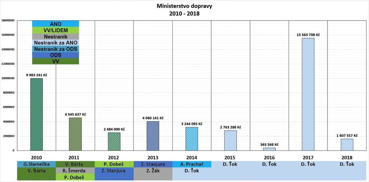 Rok 2017, kdy ministerstvo zaplatilo přes dva miliony korun za v úvodu zmíněných šest spotů o bezpečnosti plavebního provozu na řekách a vodních nádržích, byl v reklamní historii ministerstva nejmasivnější, utratilo více než 15,5 milionu korun (kromě ČT si ministerstvo platilo reklamu i na Primě, Nově a v severomoravské TV Polar). Nejméně naopak utratilo v roce 2016, a sice něco přes 360 tisíc korun (v obou letech byl ministrem Dan Ťok, nestraník za ANO).