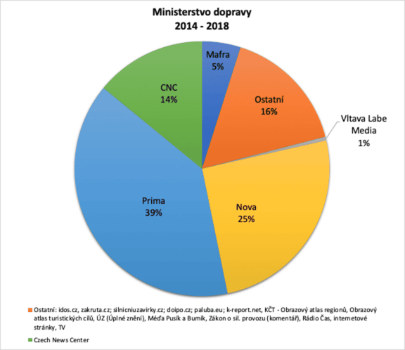 *V kruhovém grafu nejsou zohledněny: inzerce v České televizi za téměř 7,2 milionu korun (roky 2014, 2015, 2017, 2018). V roce 2015 ministerstvo inzerovalo v médiích několika vlastníků za více než půl milionu. V roce 2018 inzerovalo v médiích několika vlastníků za přibližně 360 tisíc korun. Částky nejsou v kruhovém grafu zohledněny, jelikož ministerstvo nedisponuje informacemi o konkrétních sumách pro jednotlivé vydavatelské domy.