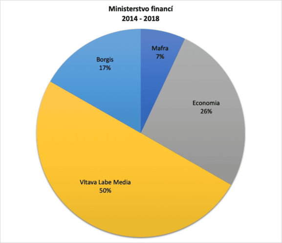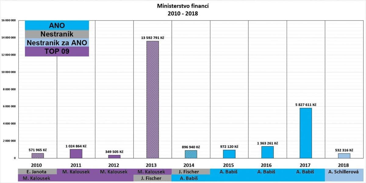 Ministerstvo financí patří s ročními výdaji kolem 24 miliard korun mezi menší resorty. Nejvíc peněz dalo za reklamu v roce 2013 (13,5 milionu korun), tehdy byl ministrem nestraník Jan Fischer, a pak v roce 2017 pod vedením ministrů ANO Ivana Pilného a Aleny Schillerové (5,8 milionu korun).