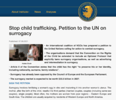 Česká Aliance pro rodinu se stala součástí mezinárodní koalice, která požadovala univerzální zákaz náhradního mateřství, už před třemi lety. Šlo o iniciativu Stop Surrogacy, jež sdružovala konzervativní skupiny z celého světa, včetně polské katolické organizace Ordo Iuris. Právě na tu je web koalice registrován. Tato hnutí společně připravila petici proti náhradnímu mateřství. Kromě českých organizací Aliance pro rodinu a Tradiční rodina je pod požadavkem podepsán také krajně pravicový think-tank Political Network for Values, který měl dostávat peníze od maďarské vlády.
