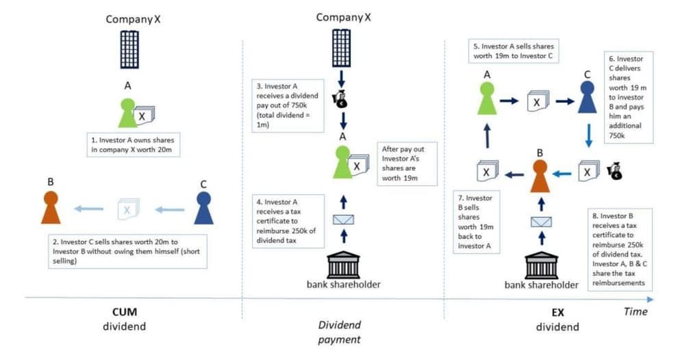 Získat od německého státu více než bilion korun se podařilo prostřednictvím komplikované právní kličky. Spočívá v tom, že si banky a spekulanti mezi sebou rychle vyměňovali akcie s nárokem i bez nároku na dividendu v době, kdy se měla dividenda vyplácet. Tímto způsobem se snažili vytvořit situaci, kdy není jisté, kdo v klíčový okamžik dividendu vlastní.