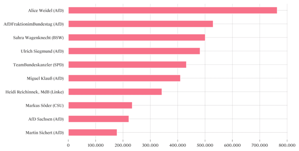 AfD dominovala rovněž v dalších metrikách. V počtu odběratelů vedl účet Alice Weidel, následovaný stranickým účtem AfD.