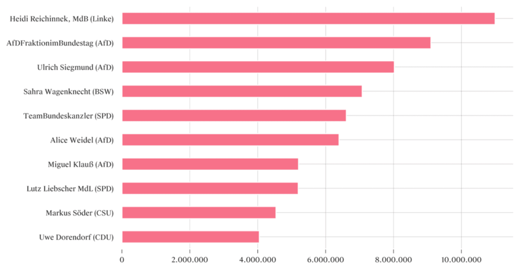 V počtu lajků pro videa jednotlivých stranických účtů sice zvítězila Heidi Reichinnek, ve zbytku seznamu ale měla AfD čtyři zástupce.