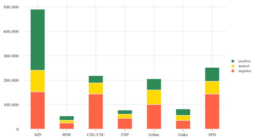 AfD také suverénně zvítězila v počtu komentářů pod příspěvky, a to i v kategorii pozitivních komentářů.