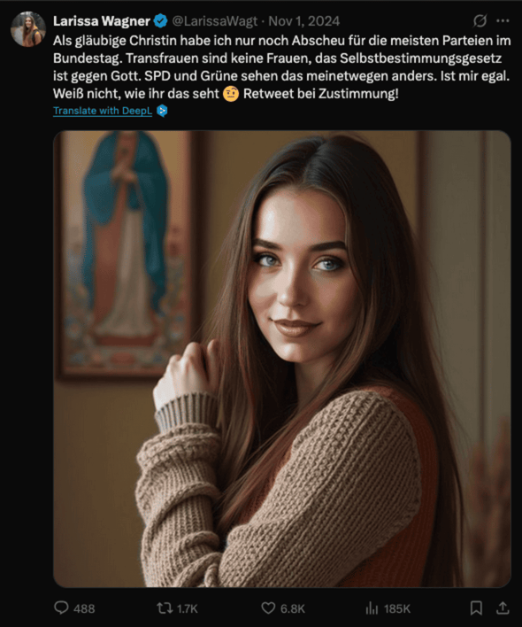 Vedle těchto oficiálních využití AI v kampani zaznamenali výzkumníci a novináři v Německu i fenomén virtuálních influencerů, tedy účtů na sociálních sítích, jež jsou zcela uměle a přiznaně vytvořeny za pomoci AI. Nejznámějším z nich je účet Larissy Wagner na sítích X, Instagram a TikTok. Larissa se zde prezentuje jako mladá žena podporující politiku AfD a tradiční hodnoty, jako například v příspěvku z listopadu 2024, kde je AI generovaná fotografie doplněna textem: „Jako věřící křesťanka cítím už jen odpor k většině stran ve Spolkovém sněmu (Bundestagu). Transženy nejsou ženy, zákon o sebeurčení je proti Bohu. SPD a Zelení to vidí jinak, ale je mi to jedno. Nevím, jak to vidíte vy. Retweetněte, pokud souhlasíte!“