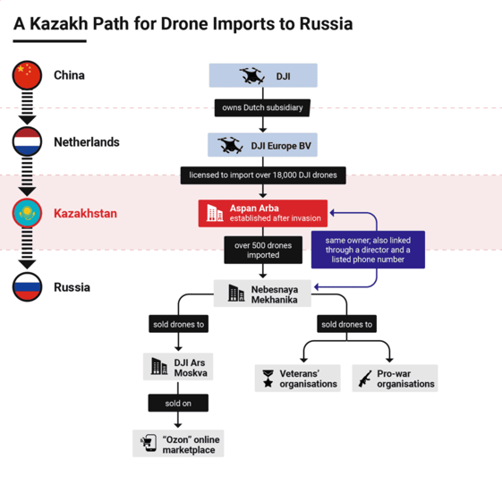 Sankce se ale obcházejí i opačným směrem, jedná se o porušování takzvaných druhotných sankcí. Letos v červnu novináři z OCCRP a nezávislého ruského média IStories zmapovalischéma, s jehož pomocí se do Ruska dostávají z Kazachstánu sankcionované drony a mikročipy určené pro ruské zbraně.