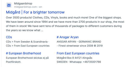 Obdobných pohnutek také využíval švédský e-shop Midgård. Nabízel třeba trička se jménem důstojníka Waffen-SS a usvědčeného válečného zločince nebo oblečení polské značky „Keep it white“, která podporuje nacistickou organizaci Blood & Honor. A také knihy Davida Dukea, jenž stál v čele Ku-klux-klanu. Kromě toho si zákazníci obchodu mohli pořídit alba kapel, jejichž texty odkazovaly na neonacistická a krajně pravicová témata a na svých přebalech používaly zobrazení skinheadů se zvednutou pravicí.